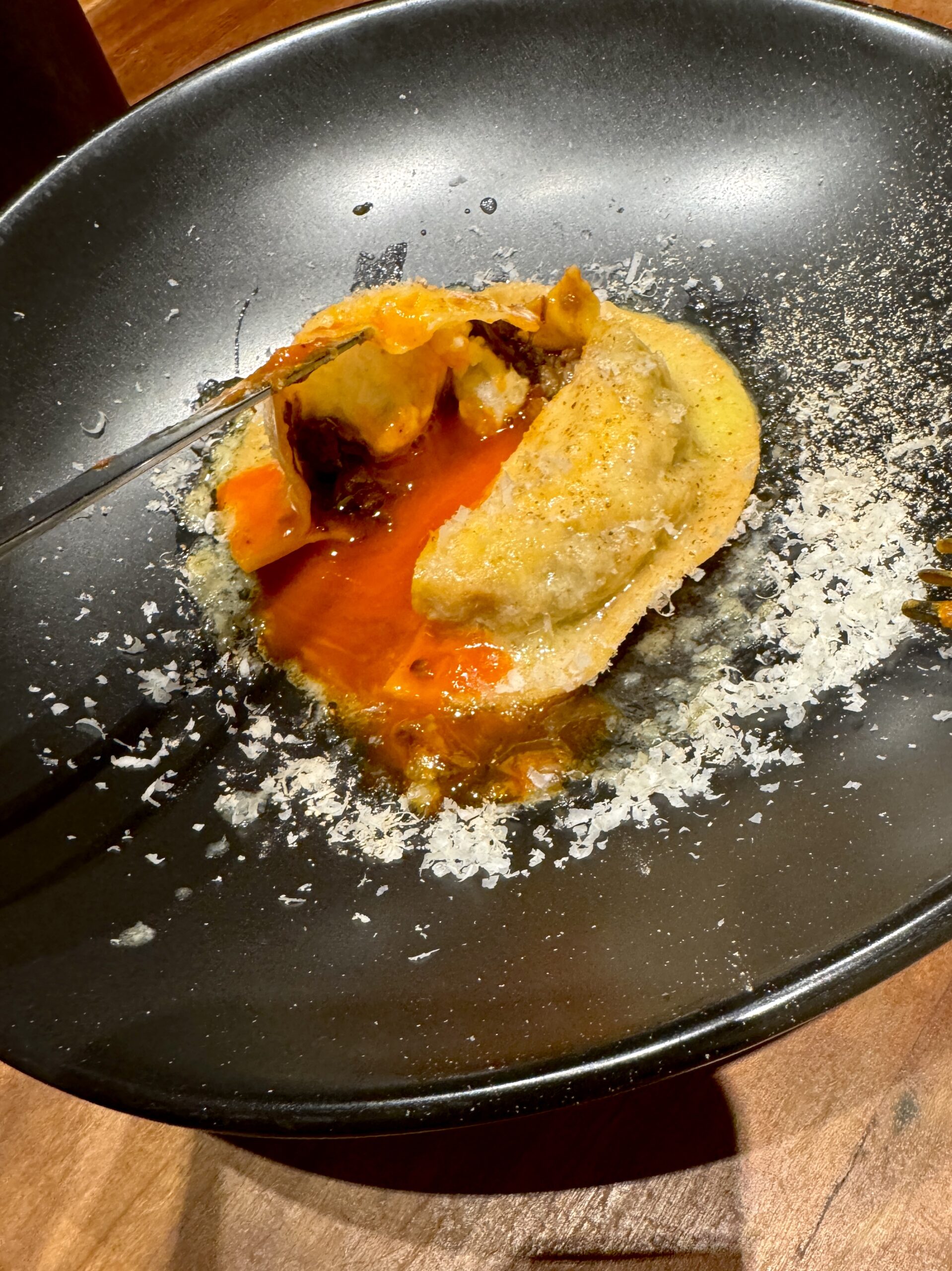 中からドロっと卵黄が流れ、猪の旨みにチーズのまろやかさ。