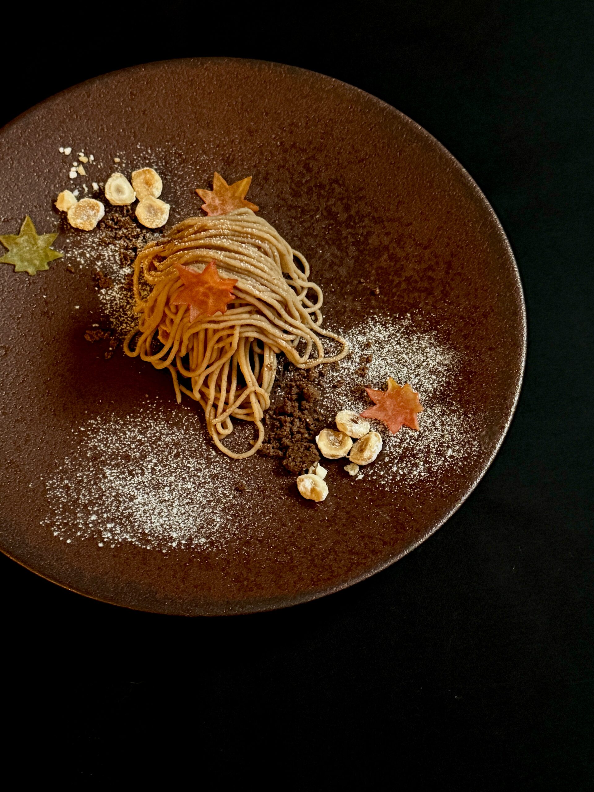 同じピエモンテ・アルバで白トリュフと並ぶ銘品・ヘーゼルナッツをジェラートしてラムのきいた栗のクリーム、白トリュフのための組み合わせ。